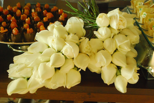 O Bolo. Vejam os buquês de botões de rosas brancas espalhados pela mesa.